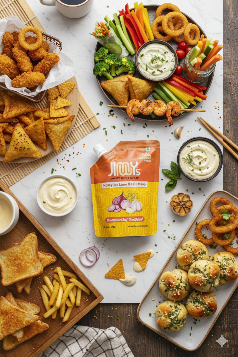 At Jimmy Mayonnaise & Sauces, we turn every bite into a delicious moment. Born from a love for good food and better company, we craft bold, 100% eggless mayonnaise that make even the simplest snacks unforgettable. No jars, no mess – just smart, squeeze-to-the-last-drop pouches packed with flavor. Whether it’s moms looking for quick, tasty fixes for hungry tiffins, chefs running busy kitchens, or snack lovers spicing up midnight Maggi, India's best mayonnaise brand has you covered. From classic creamy mayo to fun, unexpected twists, every pouch is made to dip, spread, drizzle, and devour.